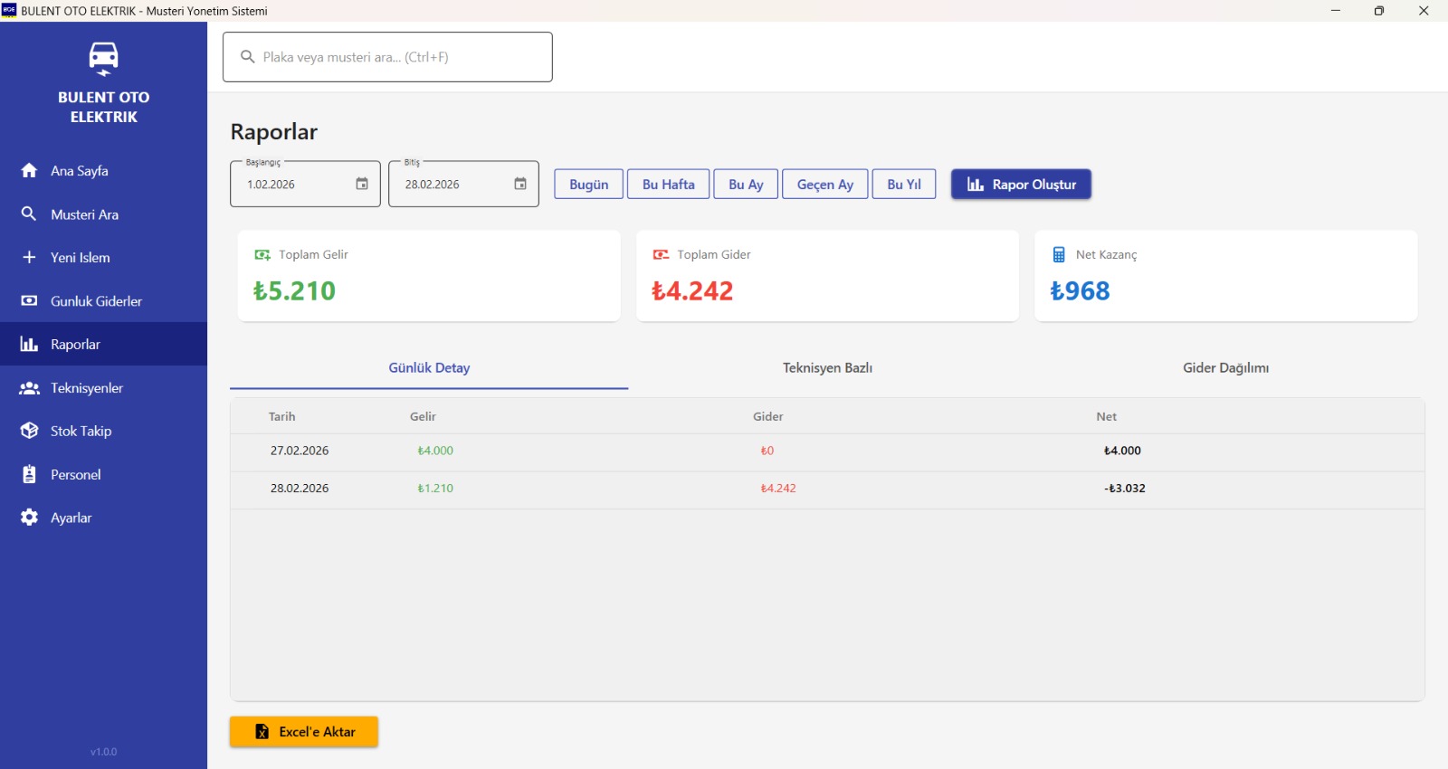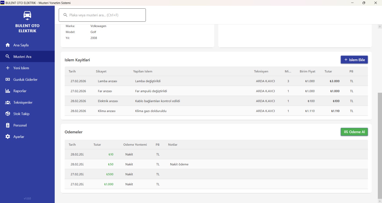 Auto Shop Manager is a freelance desktop ERP built for an auto electrical repair shop processing roughly 50 vehicles per day. The solution follows Clean Architecture across four .NET 8 projects,Core (entities, interfaces, enums, DTOs), Infrastructure (EF Core DbContext, repositories, services), UI (8 WPF pages + 5 modal dialogs + 13 ViewModels), and App (composition root with full DI configuration),all wired together with CommunityToolkit.Mvvm 8.4 using the Repository + Unit of Work + Service Layer pattern. The Material Design UI (MaterialDesignInXAML 5.3) is themed with Indigo primary and Amber accent, navigated via a fixed 220px sidebar. The dashboard shows real-time daily revenue and expense cards with percentage changes from the previous day, a monthly column chart overlaid with a line chart powered by LiveCharts2 with SkiaSharp rendering, plus the 10 most recent services and top 10 debtors sorted by outstanding balance. A global search bar with 300ms debounced autocomplete queries across license plates and customer names using culture-aware LIKE queries, returning top 20 results. The multi-line batch service entry form supports per-line complaint, work performed, technician assignment, quantity, unit price, and currency,with live-computed line totals saved as individual ServiceRecord entries in a single transaction. Multi-currency (TL/USD/EUR) debt and payment tracking automatically calculates running customer balances. A fire-and-forget Excel export system uses ClosedXML to regenerate per-vehicle customer cards, period reports (4-sheet workbooks with Summary, Services, Payments, Expenses), and daily/weekly/monthly/yearly reports on every data change,all non-blocking. Data reliability is handled by an auto-timestamped SQLite backup on every app startup with 30-backup retention and a configurable backup folder. Serilog provides daily rolling structured logs with 30-day retention. The project includes 28 integration tests with xUnit and EF Core InMemory, and distribution is handled by an Inno Setup installer producing a ~58 MB self-contained Windows executable with a Turkish-language wizard, desktop shortcuts, and proper uninstall registration. The app fully replaced the shop's manual Excel workflows on day one.
